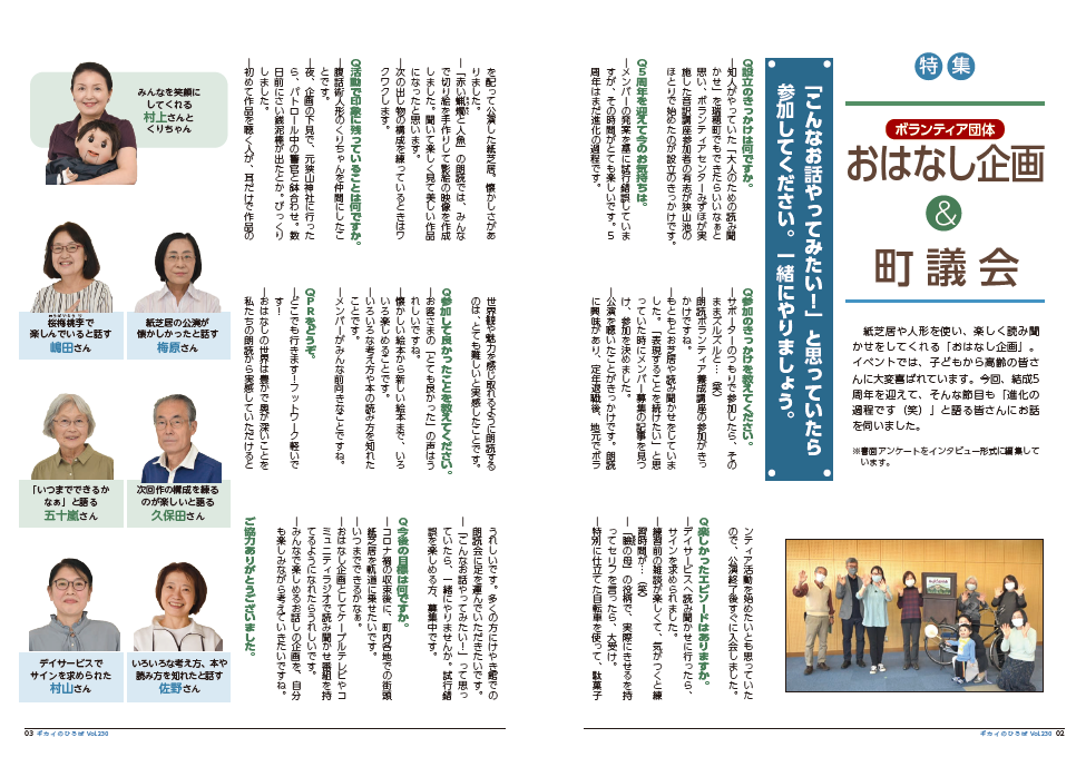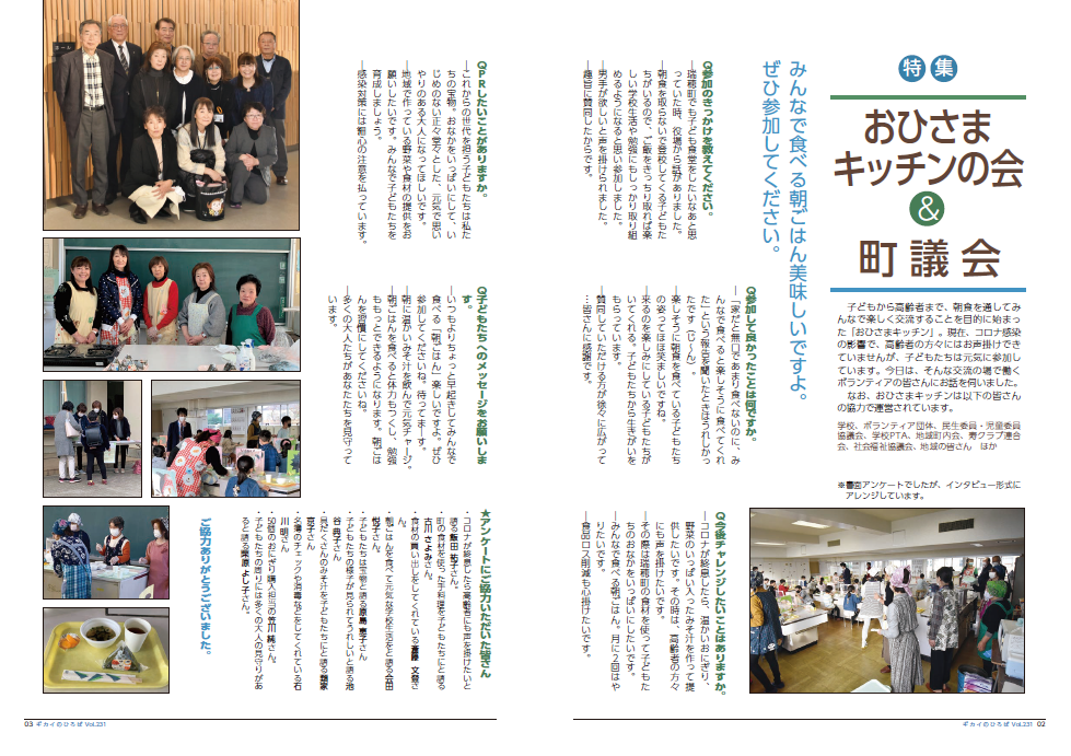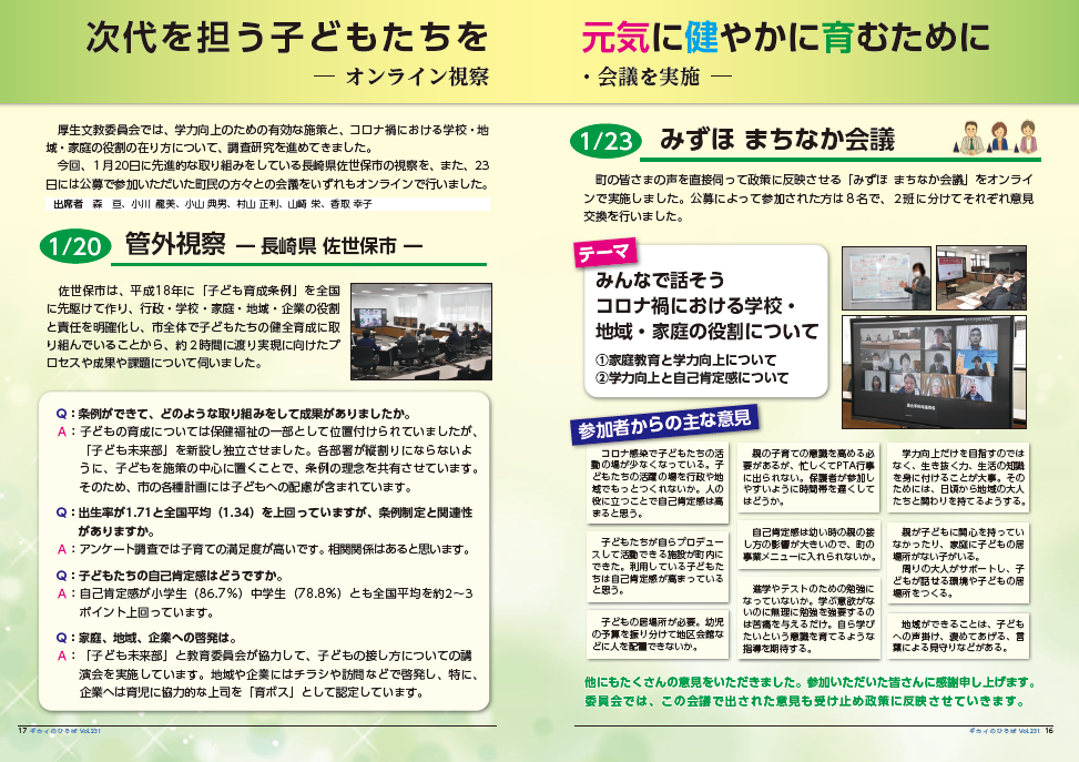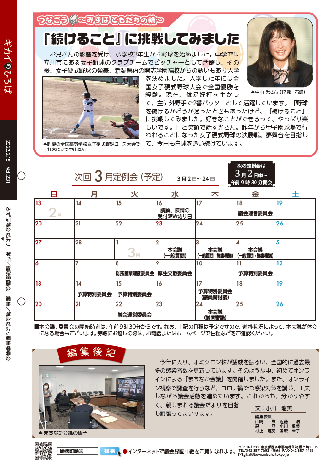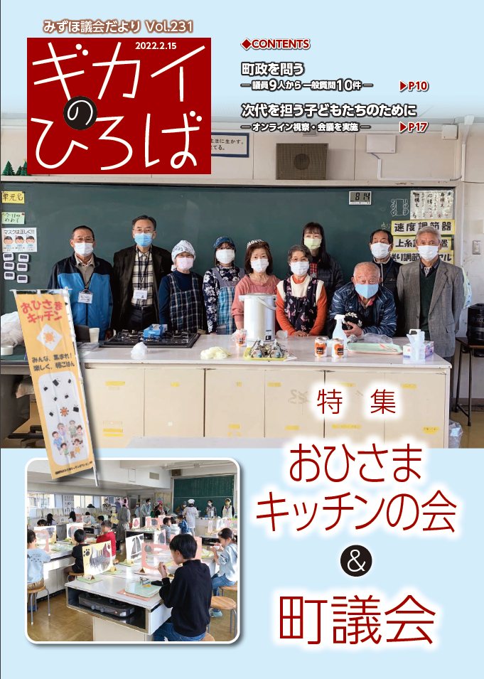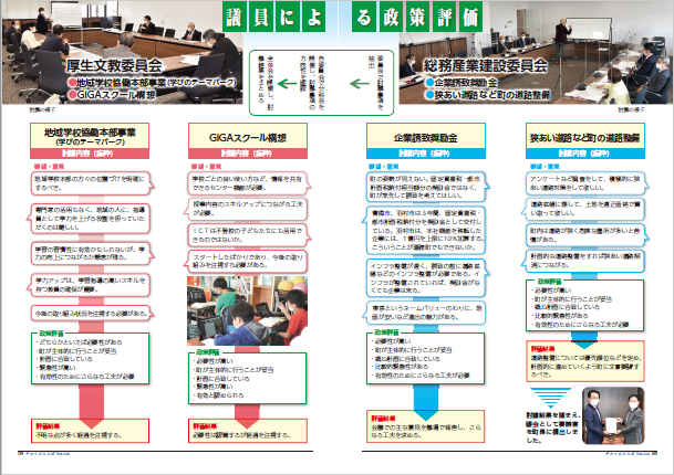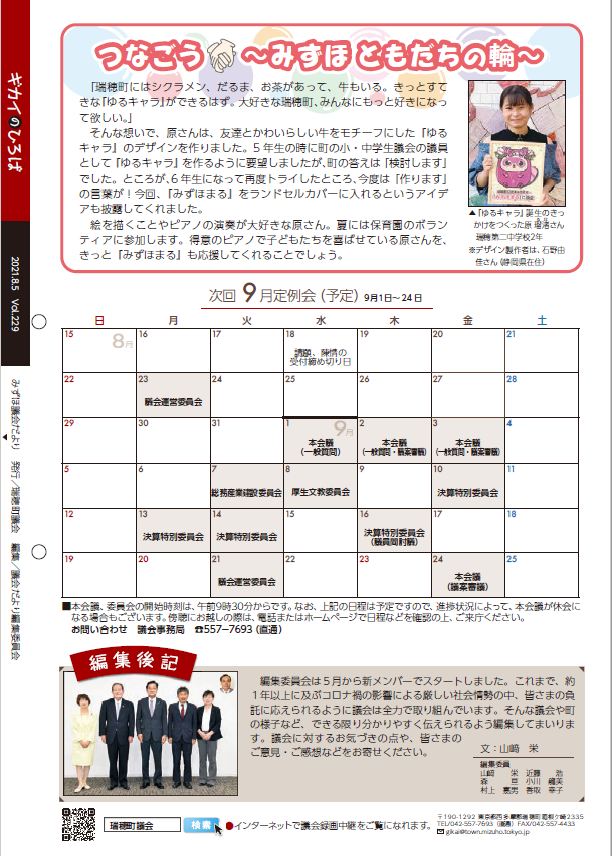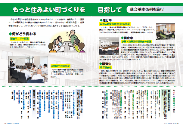 内容は、議会の結果、議員活動や活躍されている町内の団体などの特集で、議会だより編集委員会が作成し、定例会終了後に年4回(2月、5月、8月、11月)発行しています。