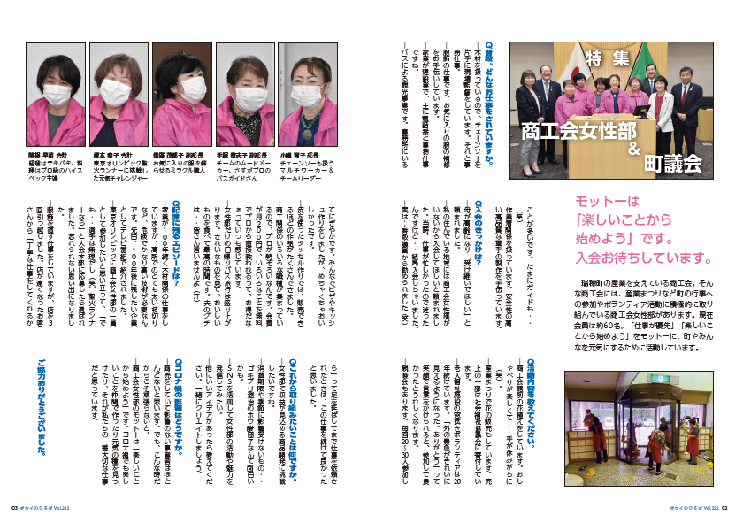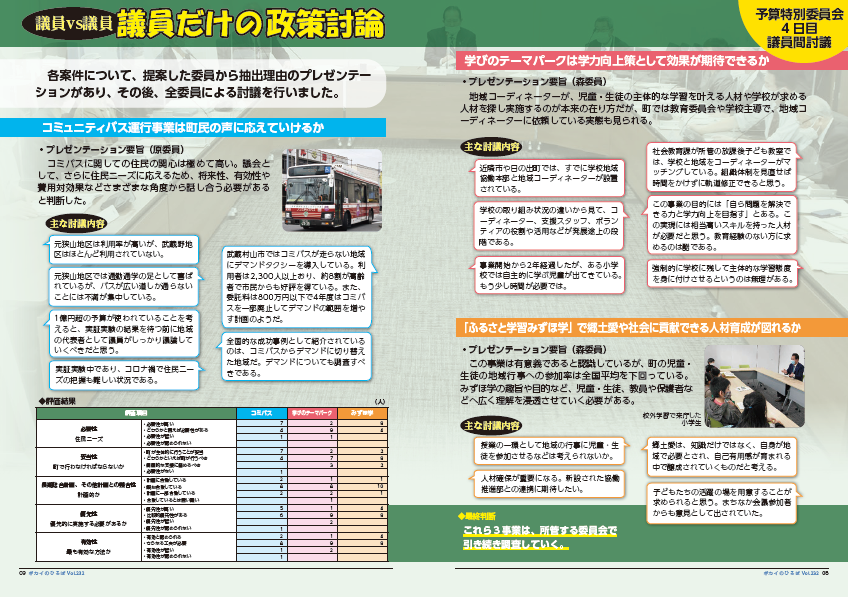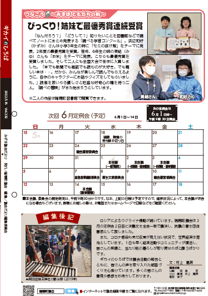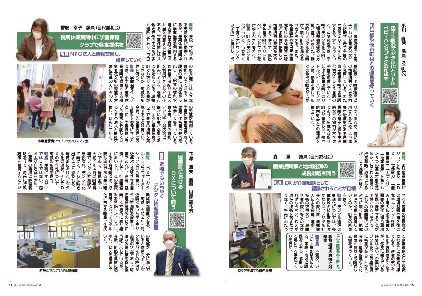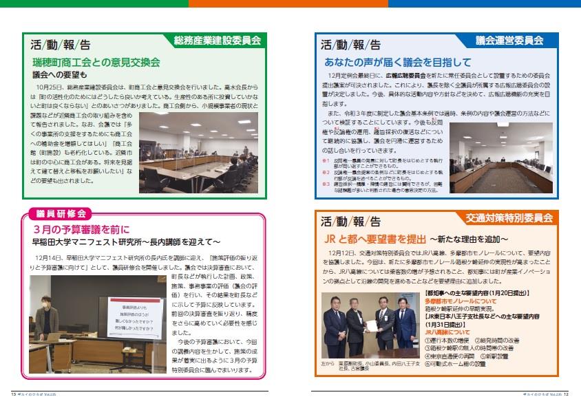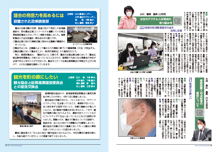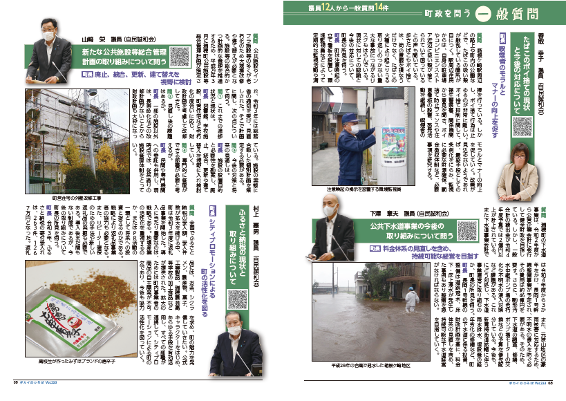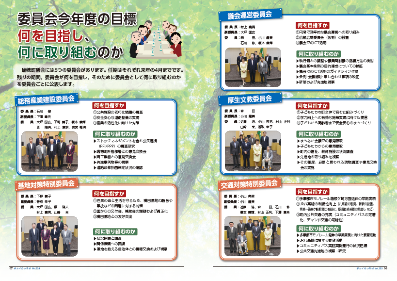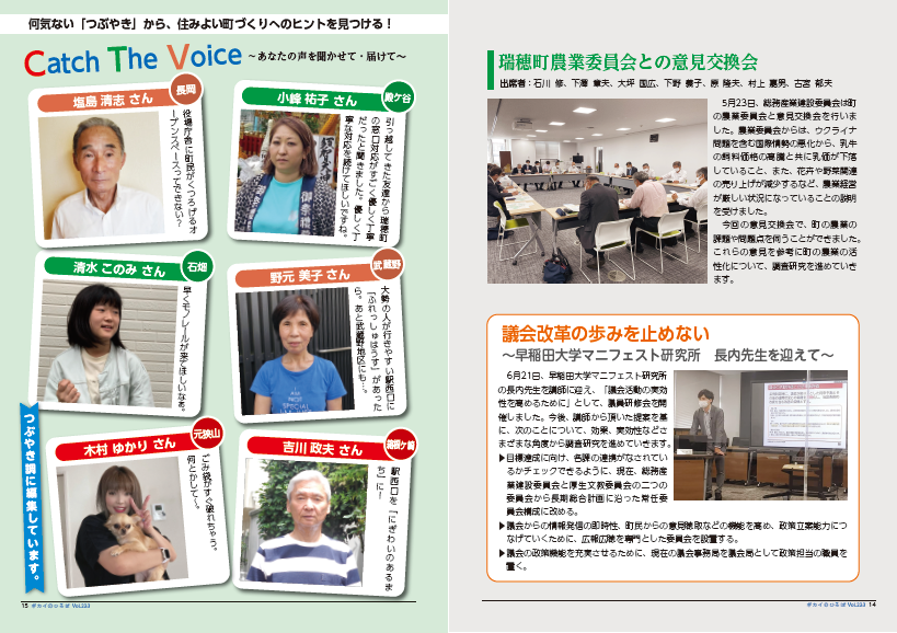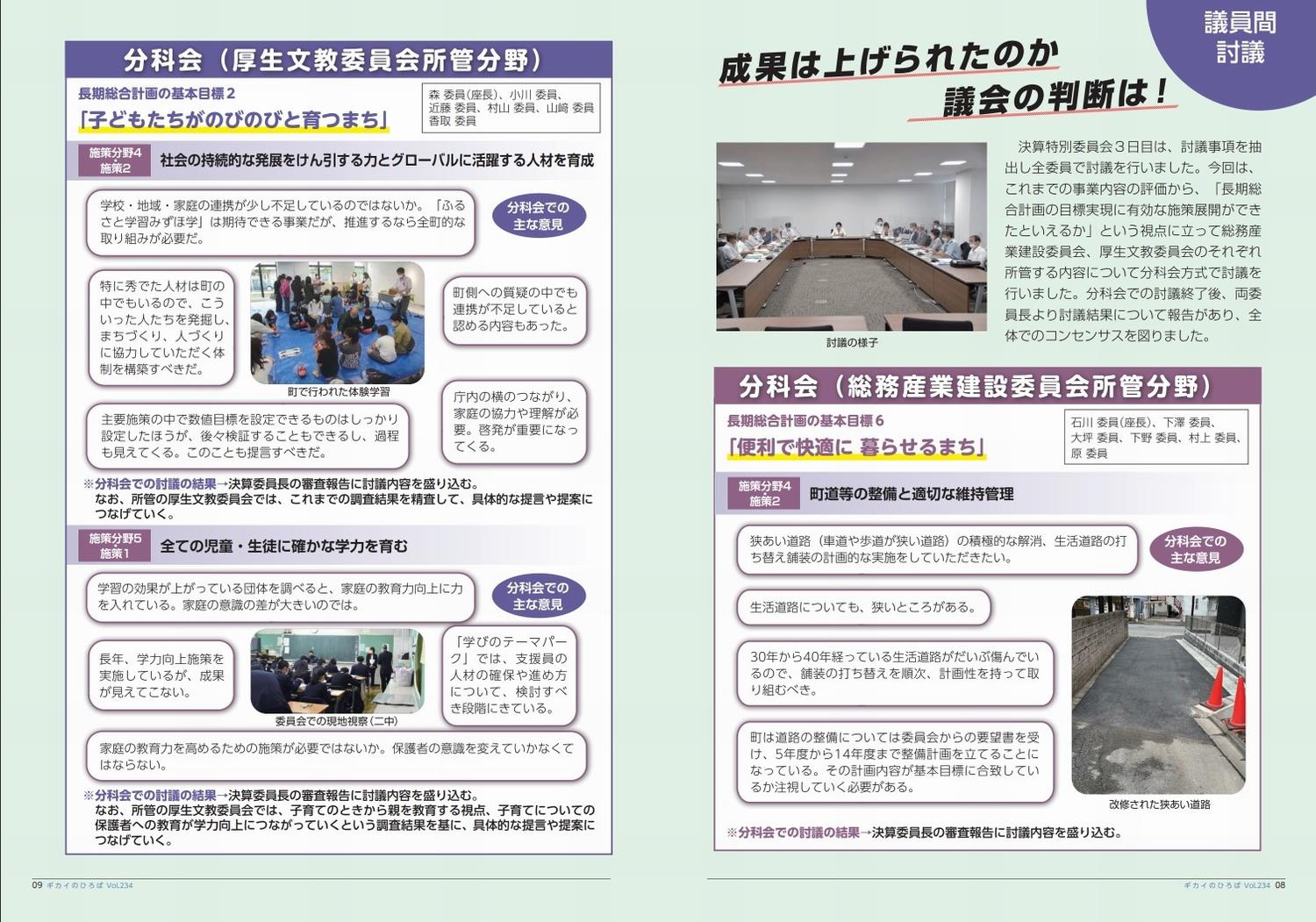 内容は、議会の結果、議員活動や活躍されている町内の団体などの特集で、議会だより編集委員会が作成し、定例会終了後に年4回(2月、5月、8月、11月)発行しています。