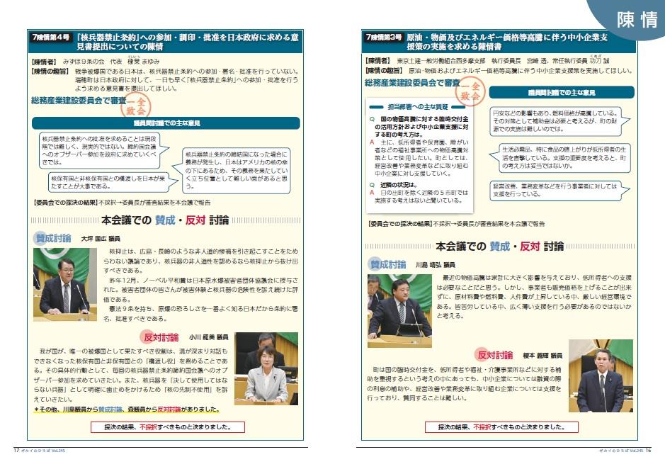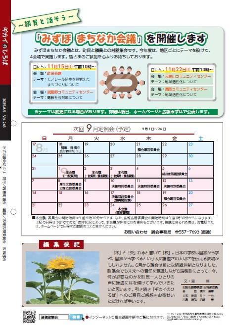 内容は、議会の結果、議員活動や活躍されている町内の団体などの特集で、広報広聴委員会が作成し、原則として年4回(2月、5月、8月、11月)発行しています。