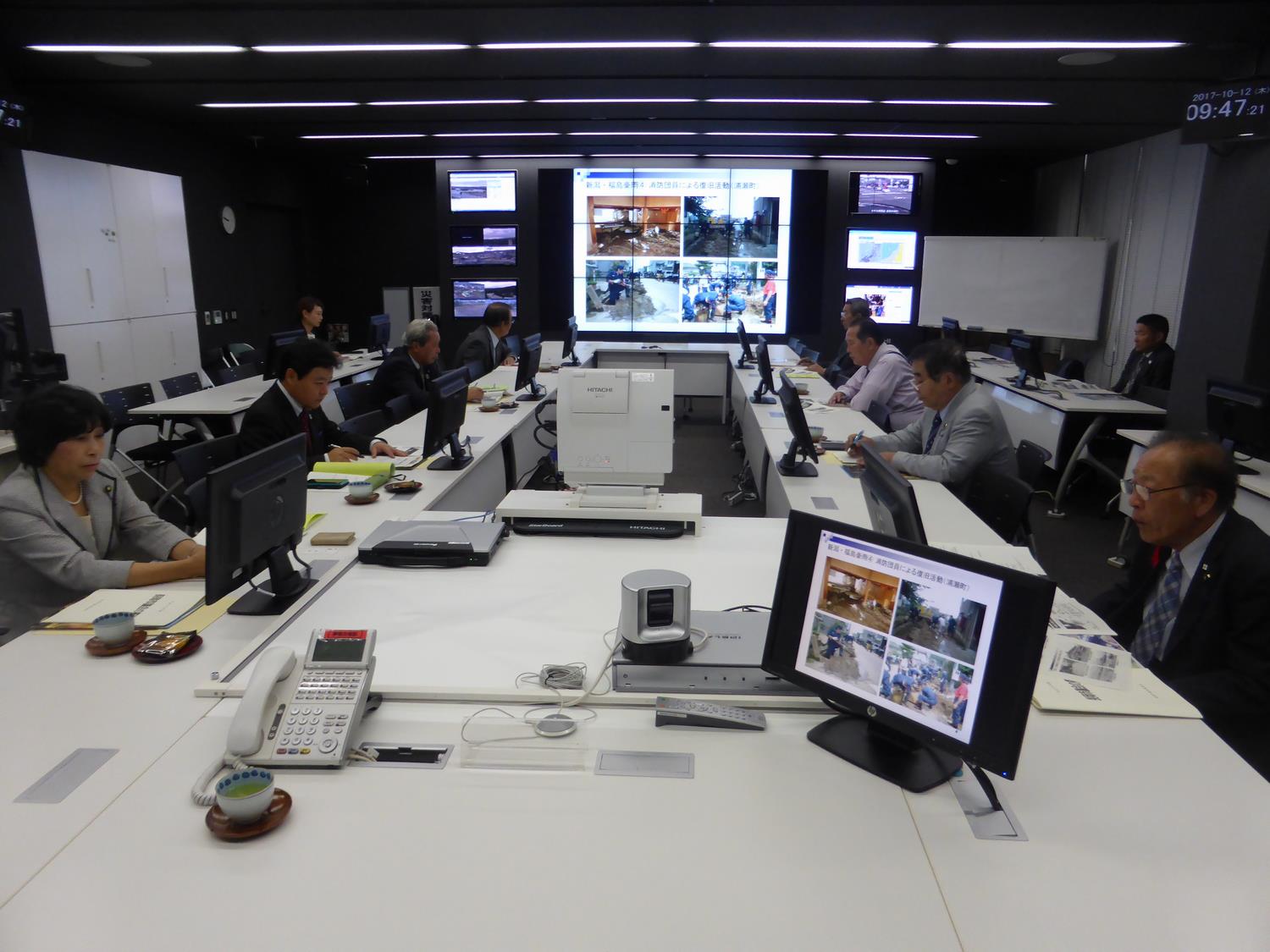 - 災害対策本部の機能強化では、約1億7千万円をかけて、常設の災害対策本部室を設けている。ここには総合的に情報が共有できるよう、大型ディスプレイに定点カメラ映像や気象情報、TV、インターネット情報が一元表示でき、迅速かつ的確な意思決定ができる環境を整備していた。今後、無人小型航空機(ドローン)の活用も予定しているとのことであった。