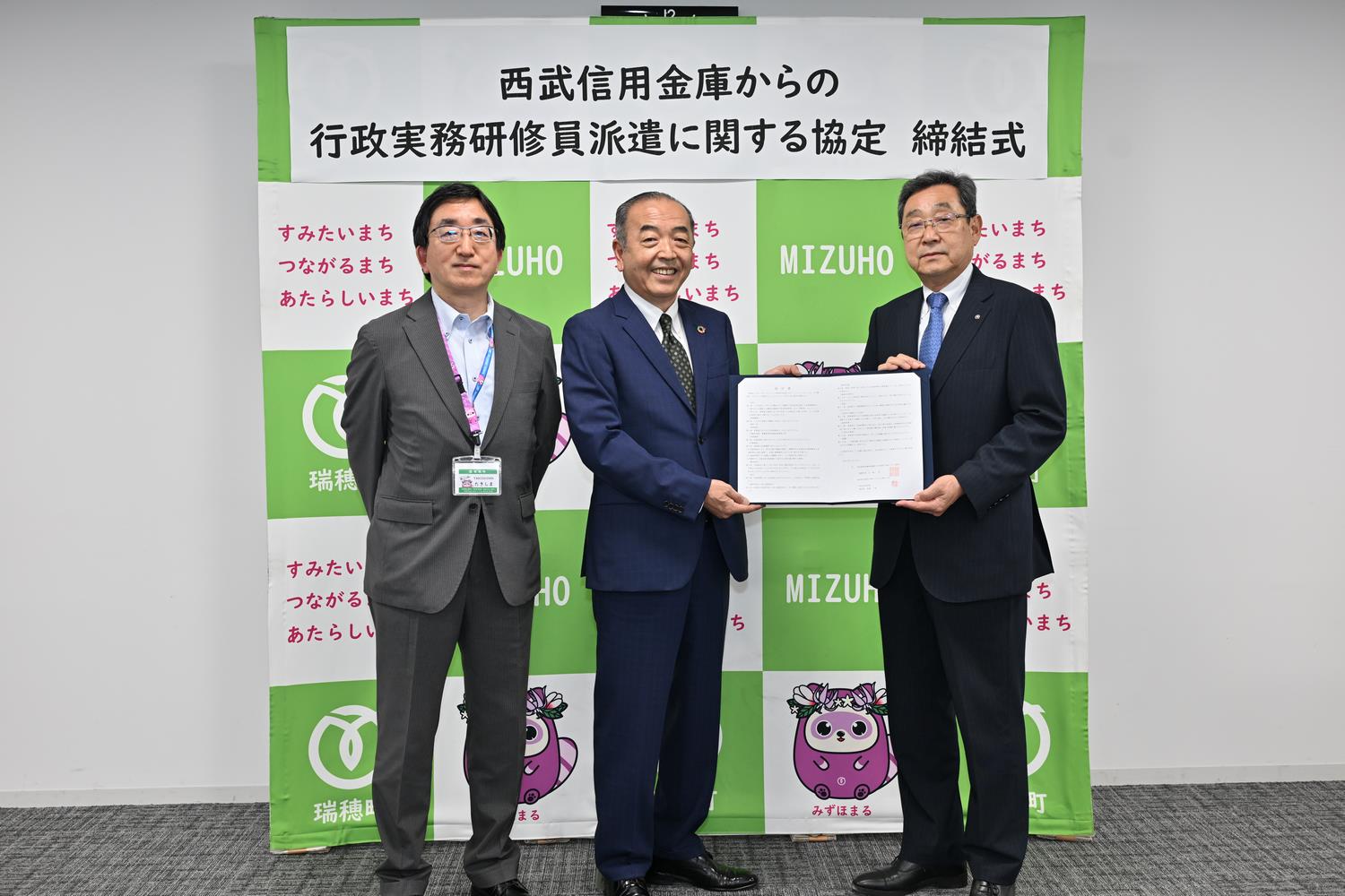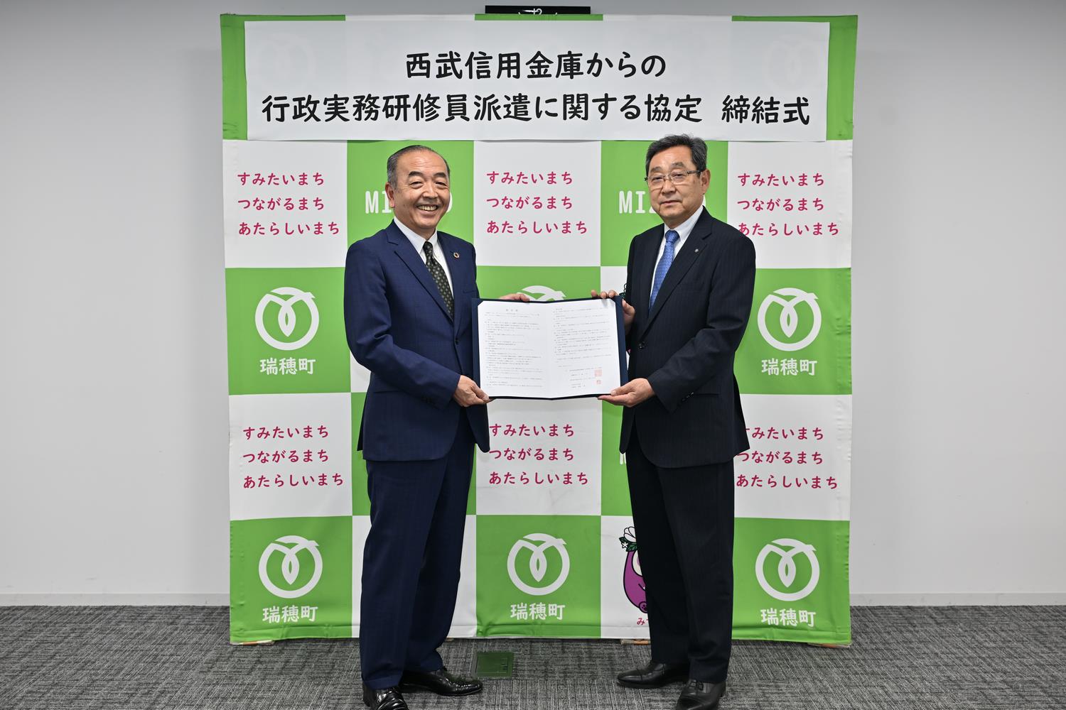 町は、西武信用金庫と令和7年1月に締結した「瑞穂町と西武信用金庫との包括連携協定」に基づき、西武信用金庫に勤務する職員を派遣していただき、町政への民間活力の導入を図り、町政の効率的な執行に寄与することを目的として、協定を締結しました。