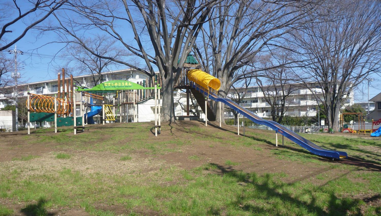公園中央の小山や大きな樹木を活用した、ロングすべり台を含む複合遊具等を設置しました。