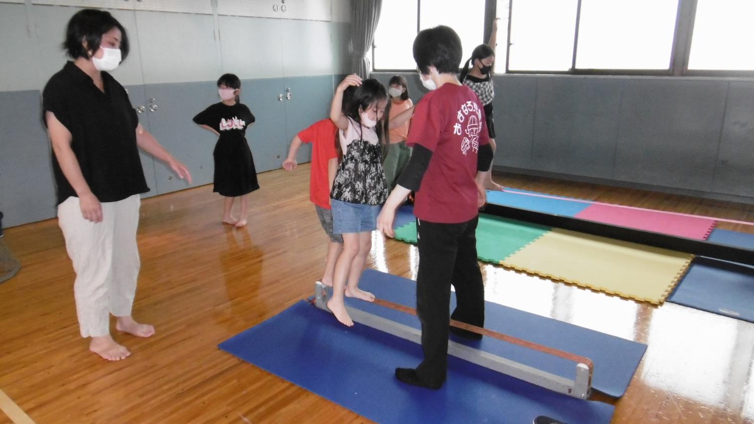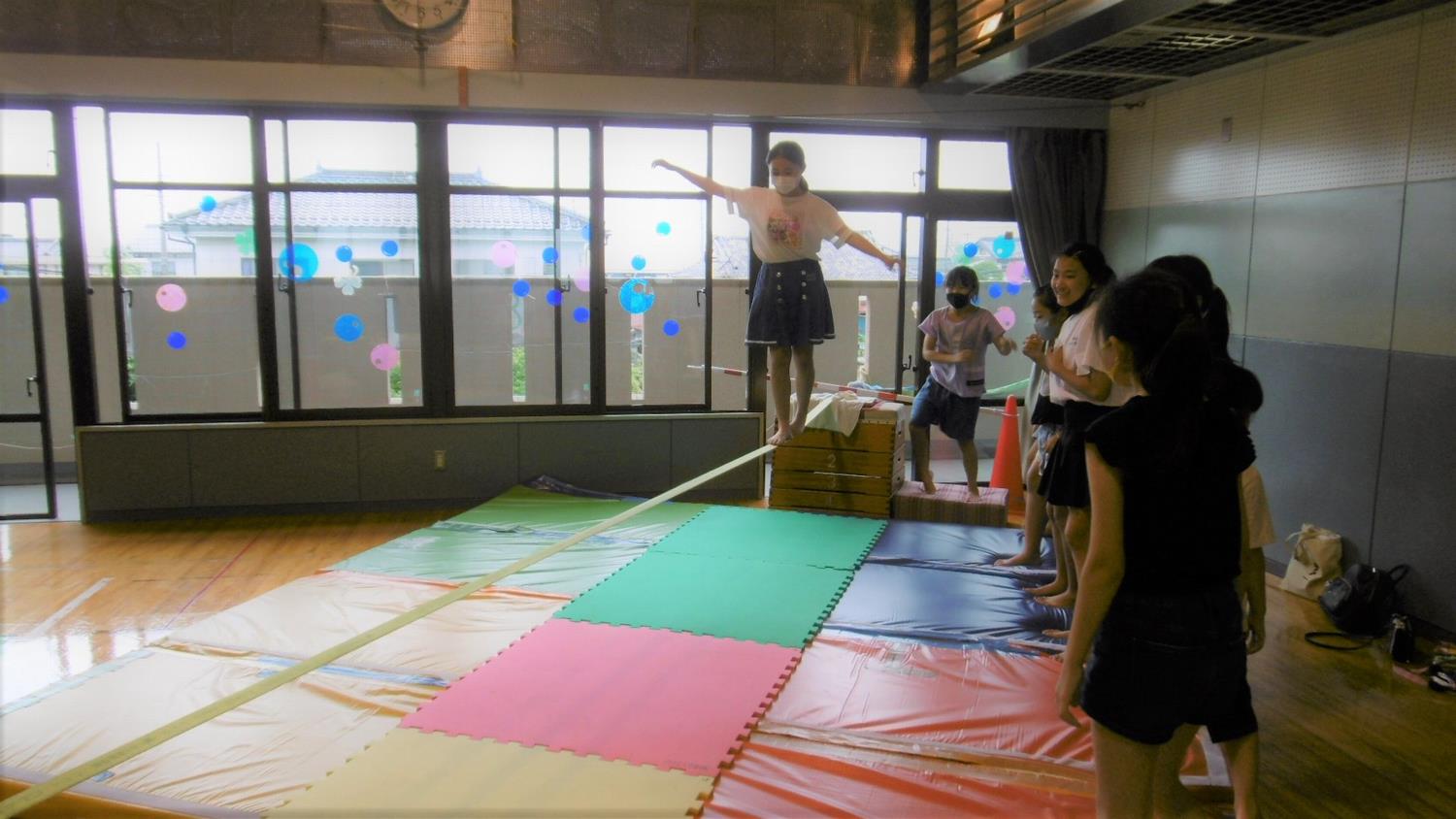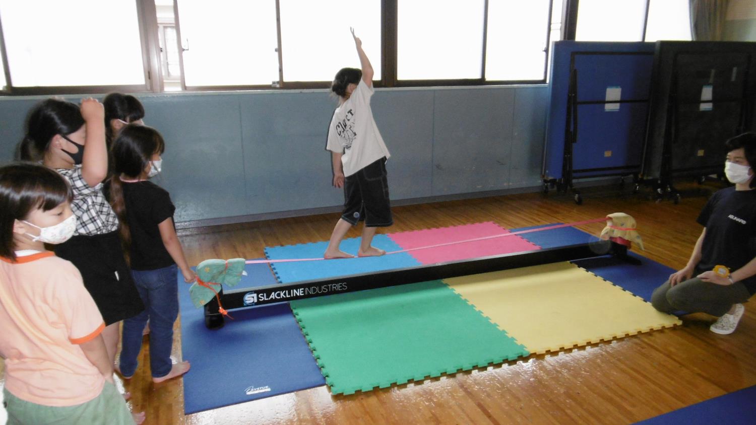 長くて揺れるラインに乗ってみよう。スラックラックで歩けるようになったら技にも挑戦しよう。
