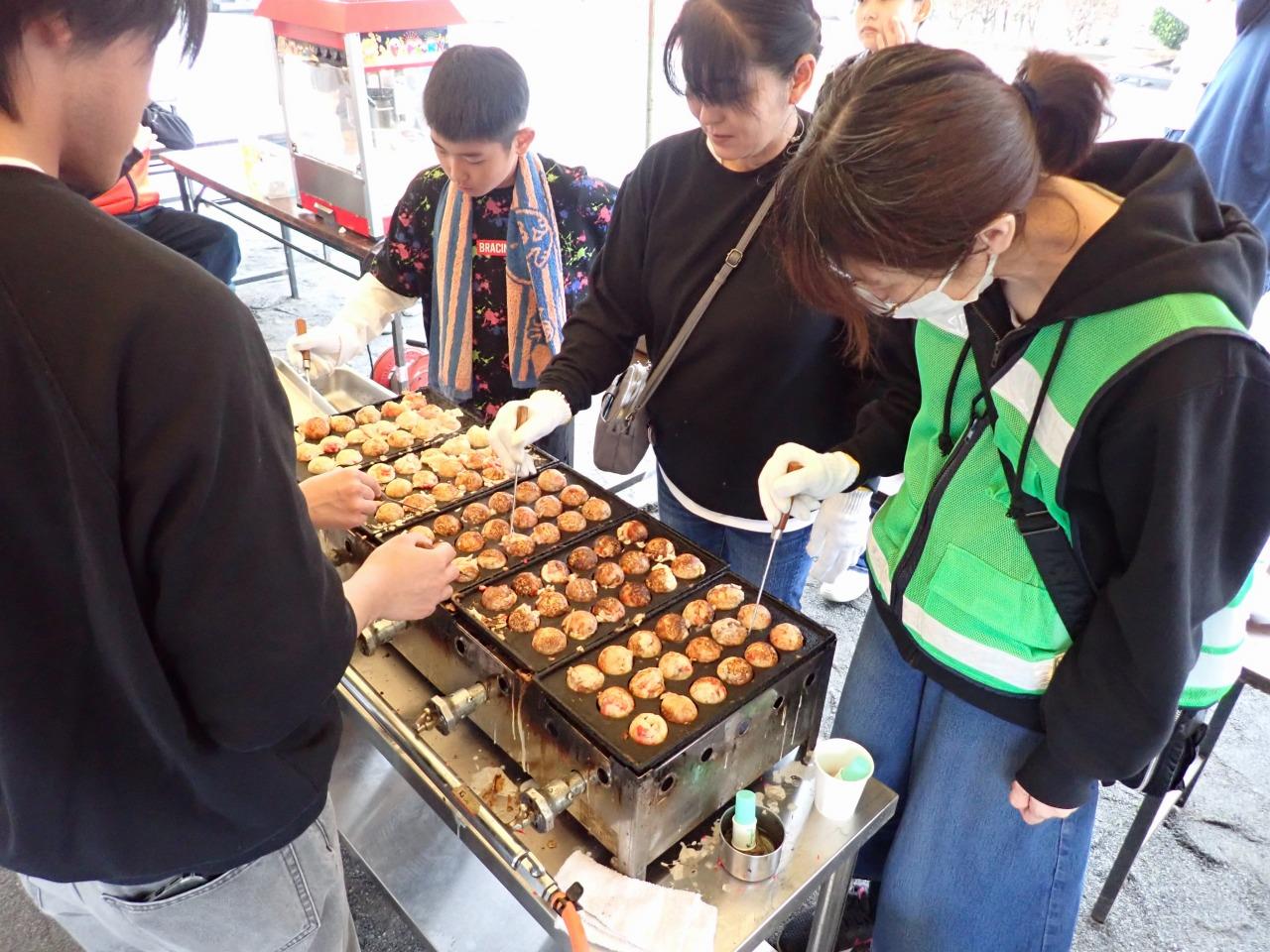 当日は雨模様でしたが多くの方で賑わいました。職員地域情報コーディネーターは、飲み物の販売、焼きそば作りやたこ焼き作りを手伝いました。