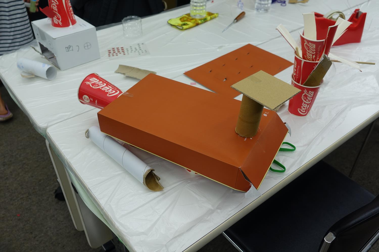 子どもたちの自由な発想で工作を行い、悩んでいる子は保護者やスタッフが手伝いました。