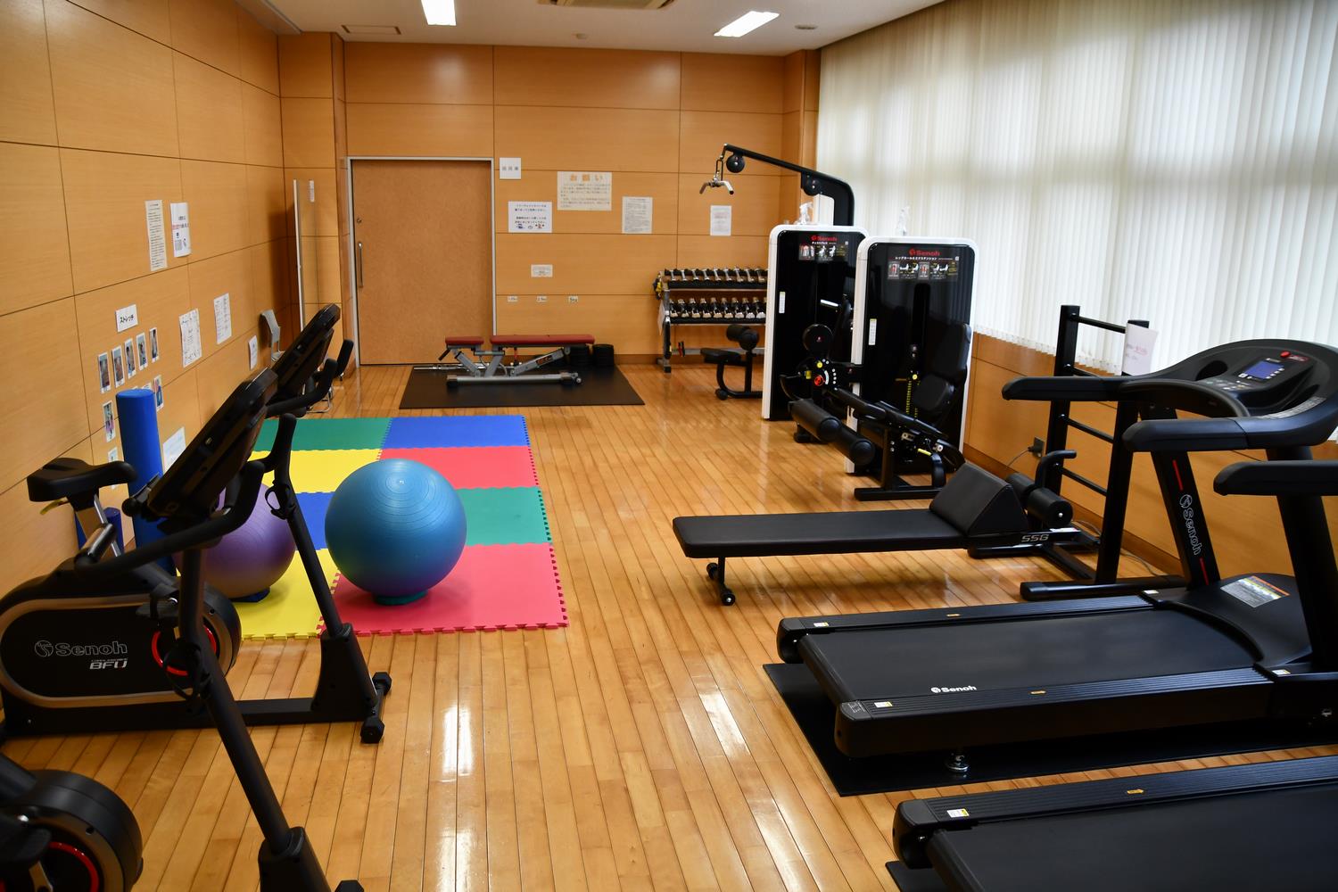 - フリーウエイトスペース:ダンベル(1から10キログラム)、バーベル(最大48キログラム)